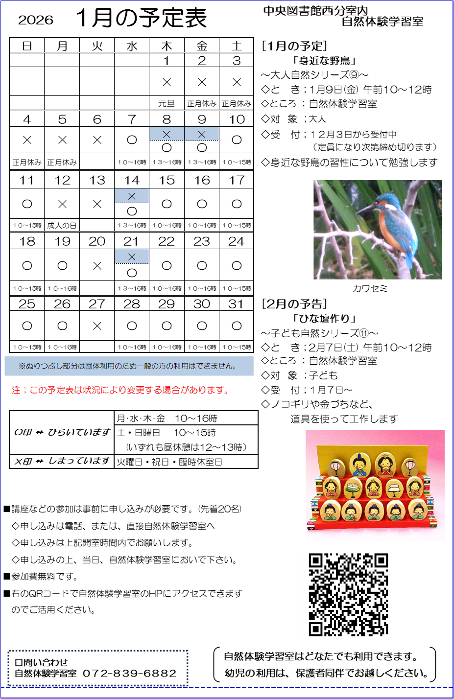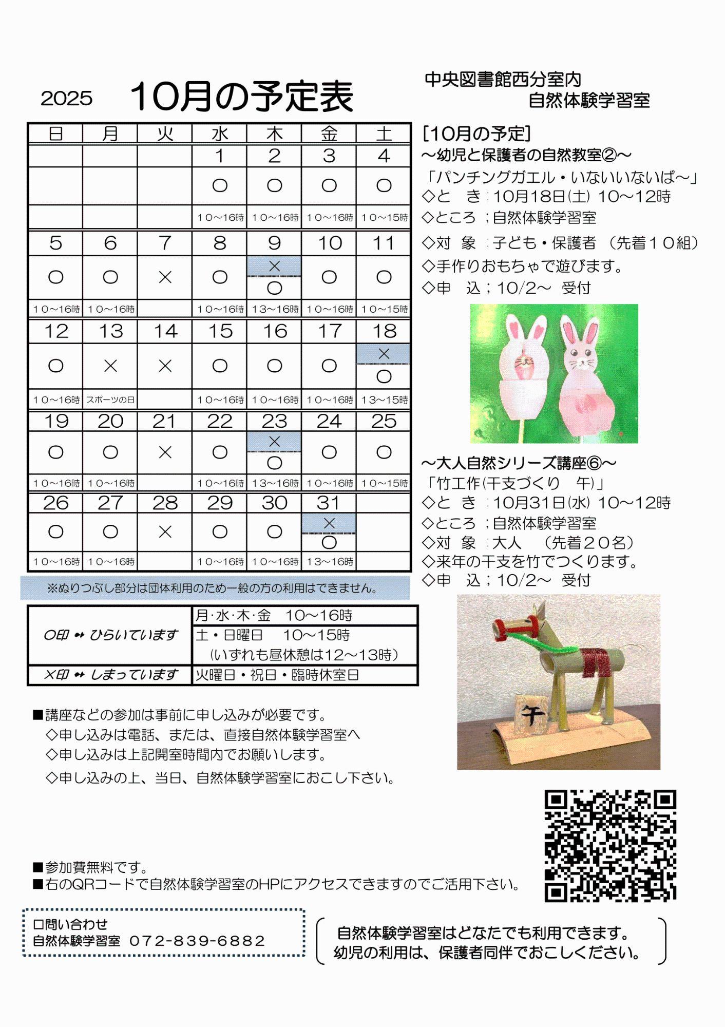 - 申し込みの上、当日 自然体験学習室においで下さい。