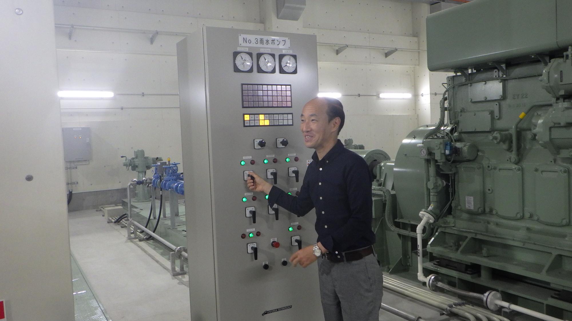 雨水本管からポンプ場に最初に雨水が流れ込む「流入渠」や水中に含まれる砂を沈殿させるための「沈砂池」のほか、最大毎秒10立方メートルの排水能力を発揮できるポンプ設備をみていただきました。