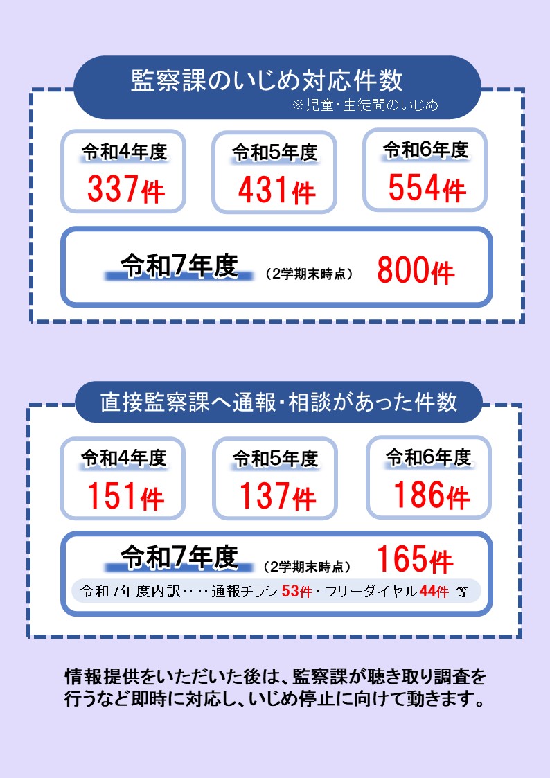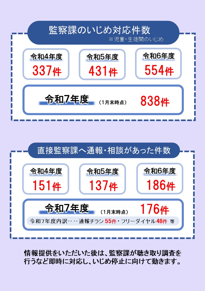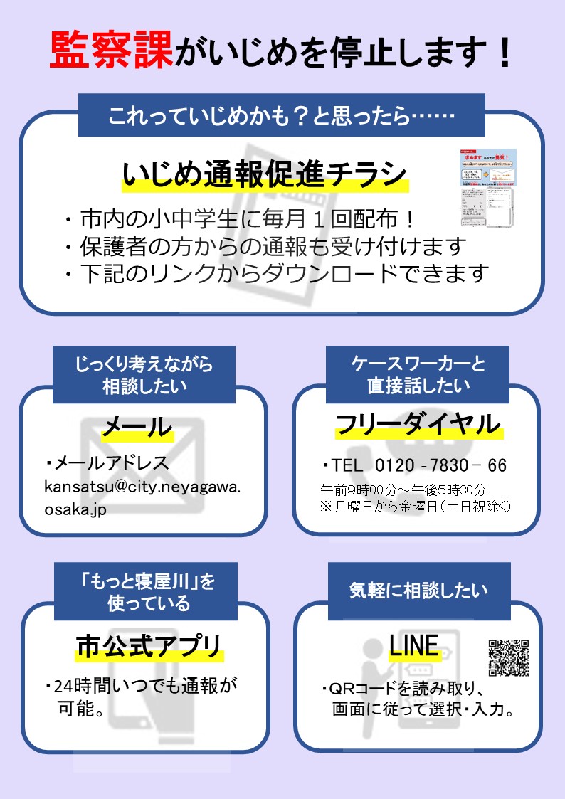 寝屋川市では毎月1回、市立の小中学校に通う児童・生徒のみなさんに、「いじめ通報促進チラシ」を配布しています。また、監察課の職員が直接対応する「いじめ相談フリーダイヤル」の設置など、攻めの情報収集を行っています。詳しくは以下のリンクを御覧ください。