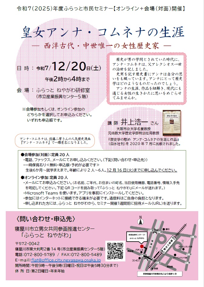 ●会場参加(対面):定員20人(申込順)/ふらっと ねやがわ研修室