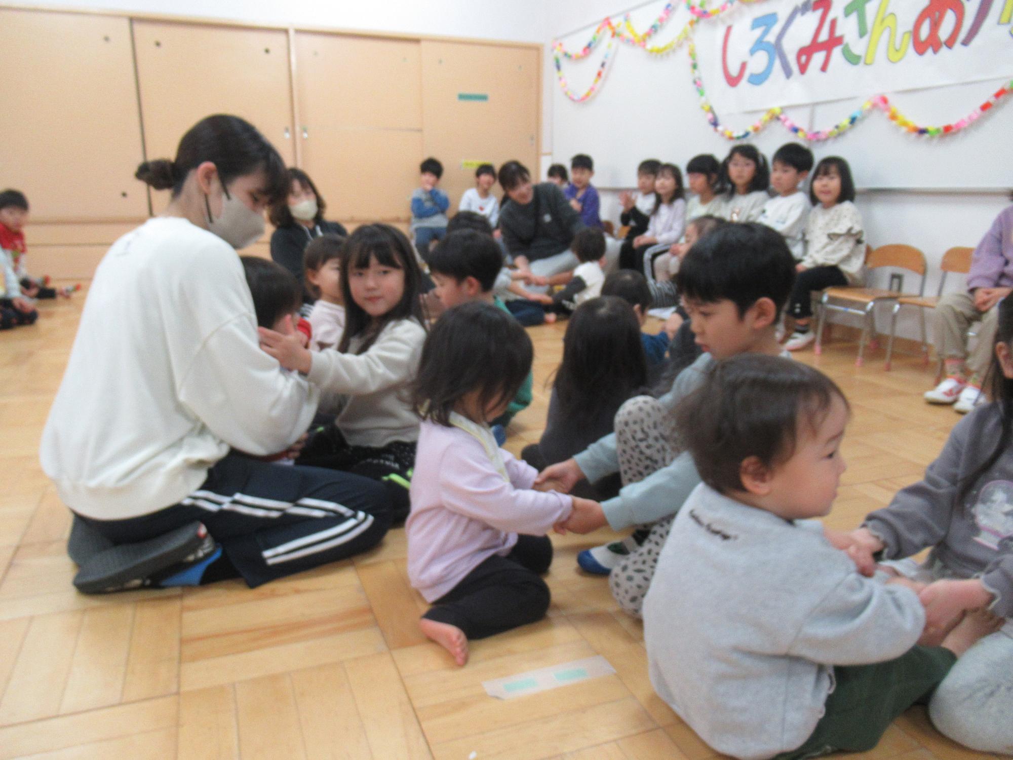 0.1.2歳児のお部屋には4歳児さんが「小鬼」に、5歳児さんが「福の神」になってお部屋に来てくれました。