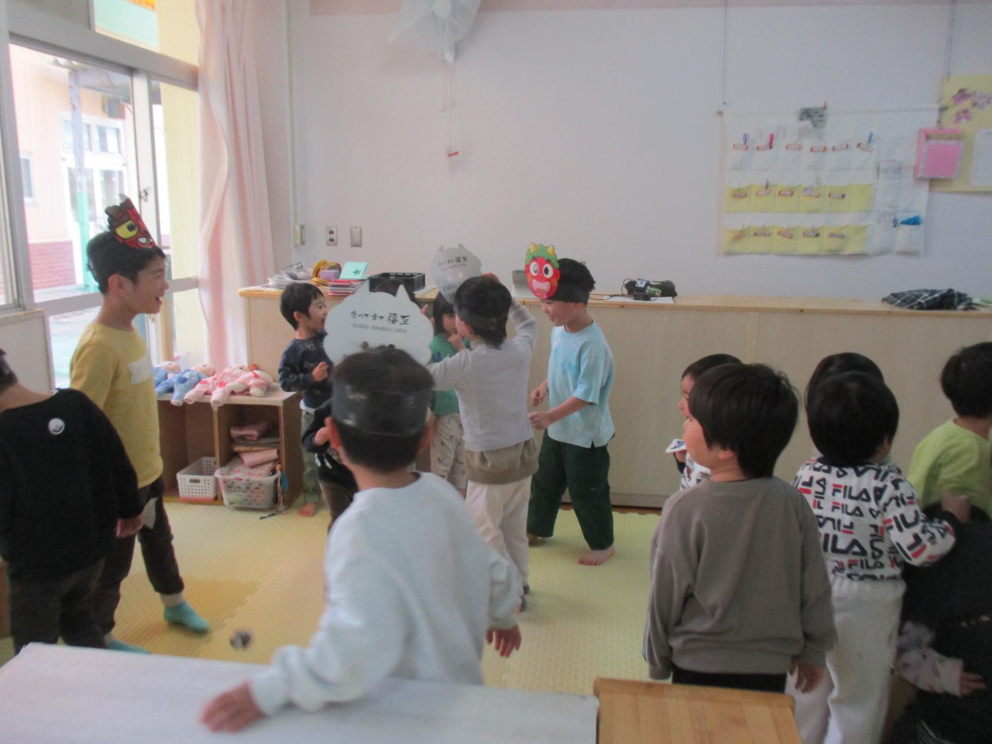 「みんなを驚かせるぞ!」と気合十分で各クラスを回ってくれた白組さん。お面もバッチリ決まっていて、その迫力に所内は大盛り上がりでした。