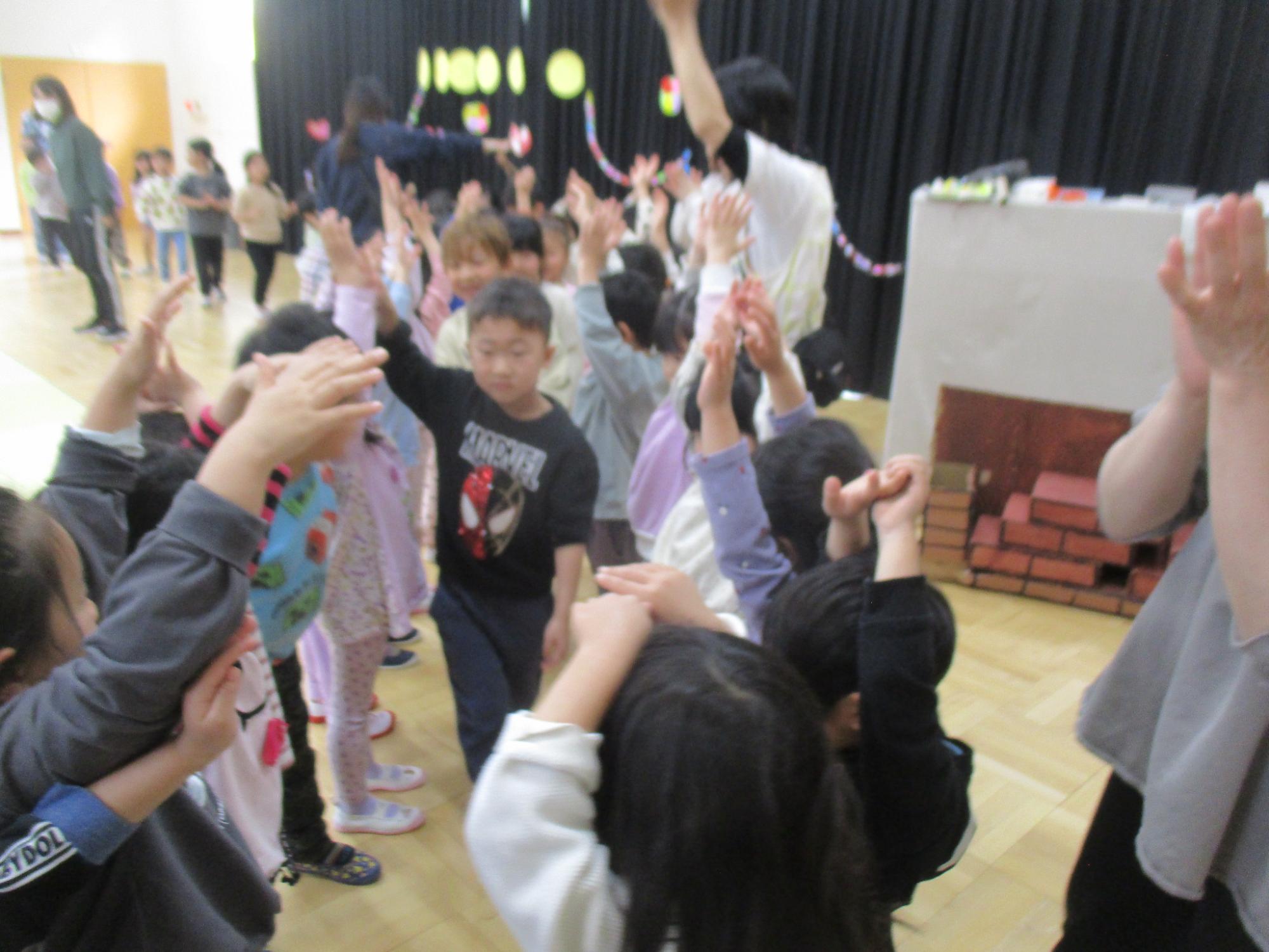 4歳児は大好きな♪100%勇気♪の曲に合わせてパラバルーンをしました。はじめはなかなか息が合わなかったけど、少しずつ気持ちが合いだし、ふわっとパラバルーンが空に向かって上がると大歓声💓でした。