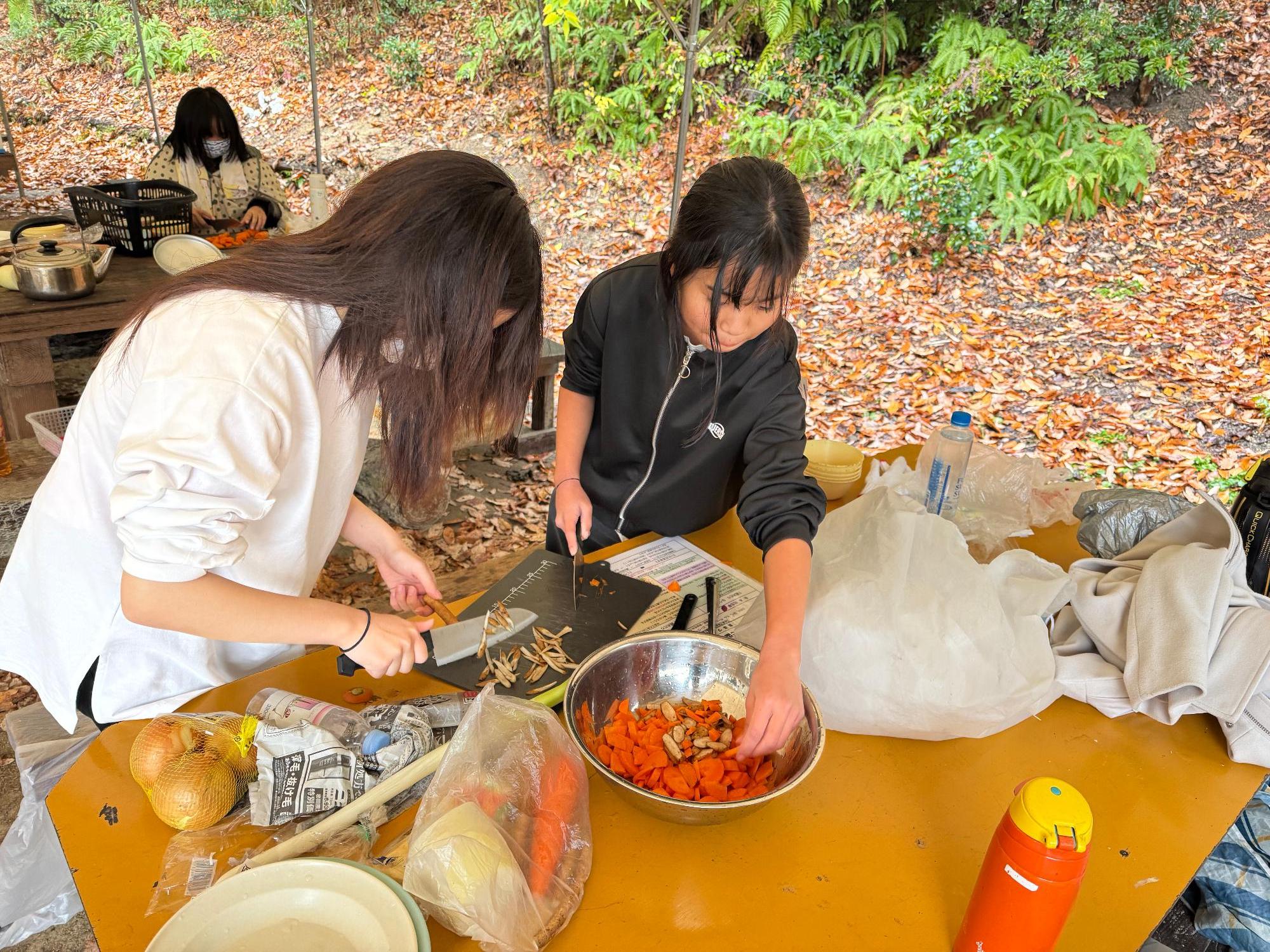 今回の野外炊事メニューは「豚汁」「ご飯」「焼き芋」。