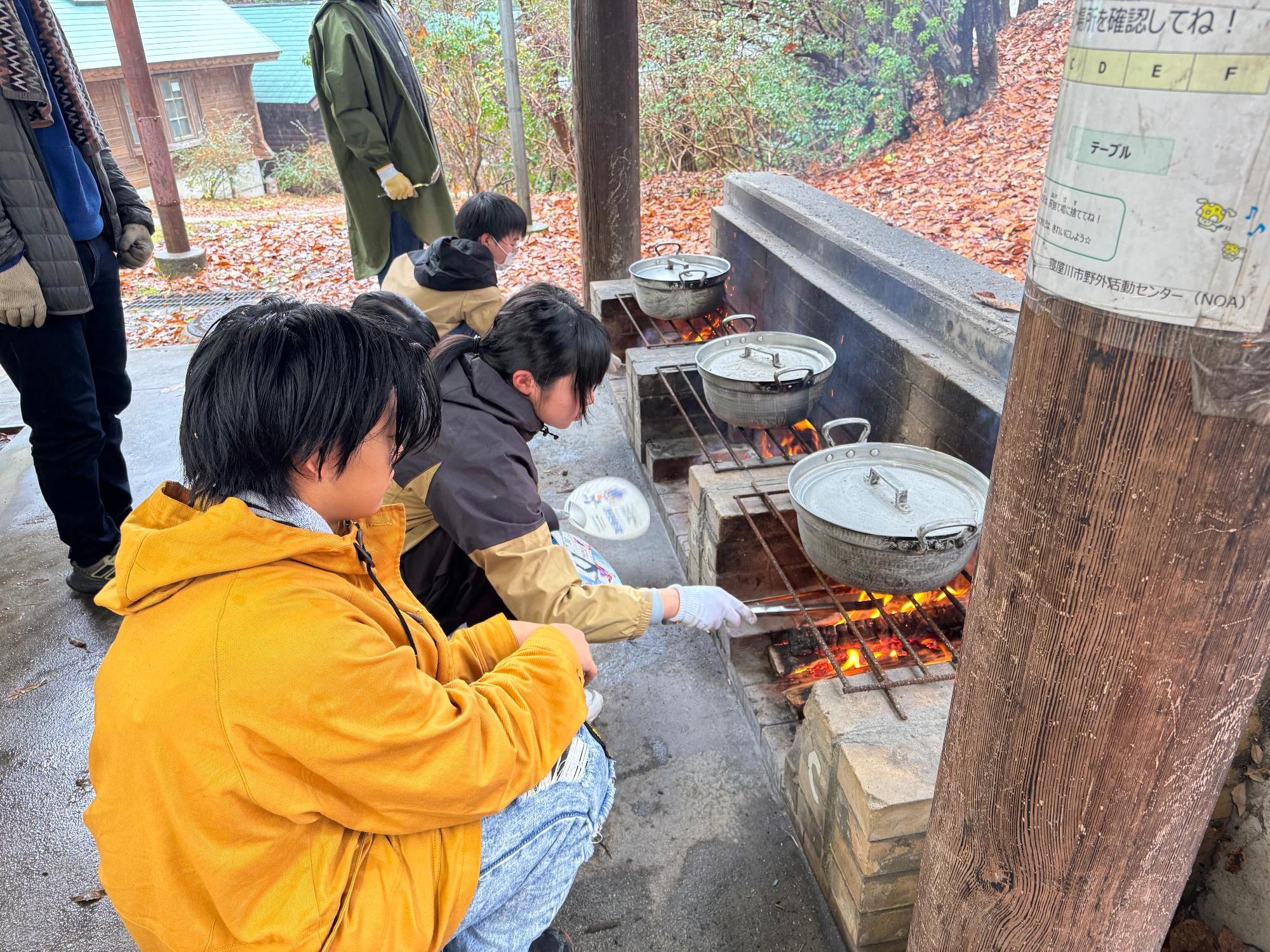 野外活動センターにて全員で火起こし体験や火の管理の仕方、カレー作り体験を行いました。