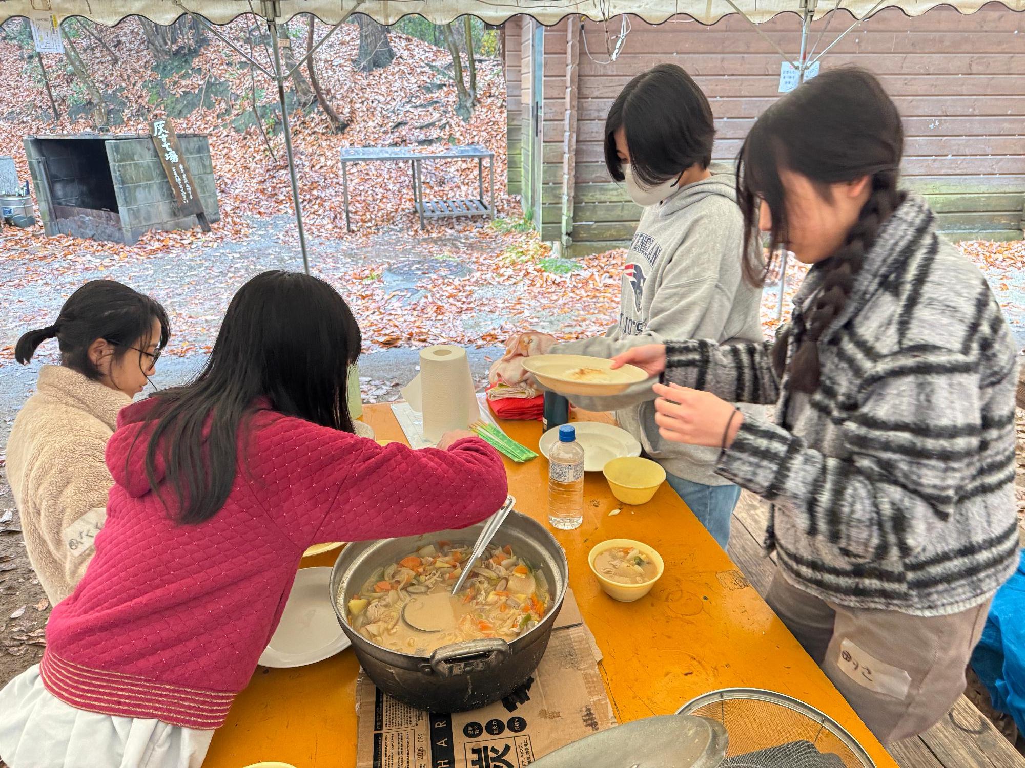 秋に収穫した「さつまいも」を使用して、豚汁や焼いも等の野外炊事を行いました。