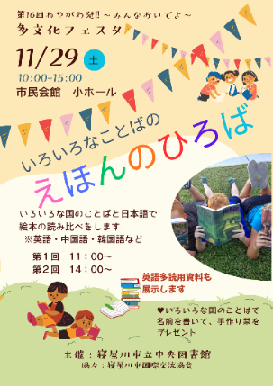 「第16回ねやがわ発!!~みんなおいでよ~多文化フェスタ」内で、いろいろな国のことばでかかれた絵本とともに、日本語でかかれた絵本も展示します