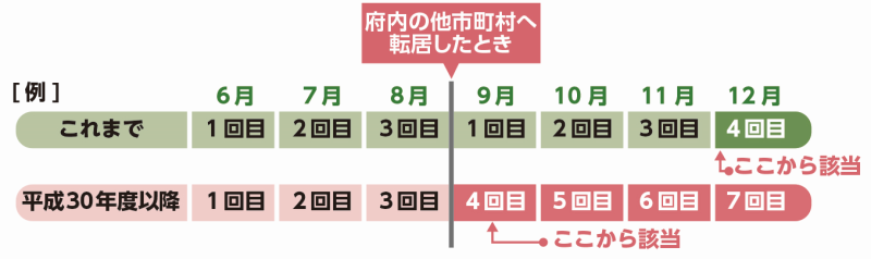 府内の他市町村への転居で、同じ世帯であること(世帯主の継続性)が認められたときは、転居前の該当回数を通算できるようになります(下の図のとおり)。