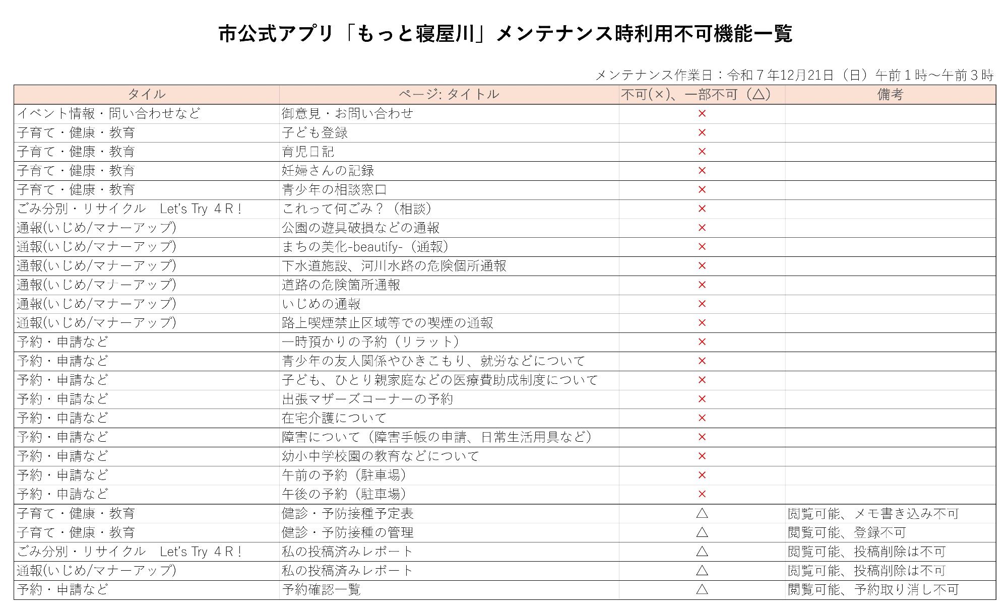 市公式アプリ「もっと寝屋川」のメンテナンスのお知らせ